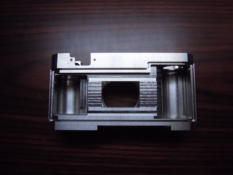 In contrast, this prototype was designed as a trigger-wind camera from the start, using a rack-and-pinion mechanism to keep the body compact.